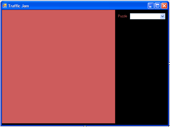First, I will be using Visual Basic 2008 Express Edition. I will try to point out any differences between using 2008 and using 2005. However, there is no reason to not follow along with 2008 as it is free to download from Microsoft. Just follow this link: Now that that is out of the way, let's go ahead and get started. This step will not contain any coding. We will simply be creating the Windows Form to be used to display the game and placing all of the controls on it. as they need to be placed. It is important that you follow along carefully if you are not familiar with Windows programming as it can seem quite daunting at first. It isn't too bad as long as you follow along carefully. Open Visual Basic 2008. You should now be at the Start Page for Visual Basic 2008. On the left hand side, you will see a box that says "Recent Projects". At the bottom of this box, you should see a line that says "Create: Project". Click the project on that line. Leave the next window on Windows Forms Application and give your program a name. I will use "Traffic Jam". Expand the form a little, then hover over the Toolbox tab on the left of the screen. Expand the "All Windows Forms" view and then double-click on the Picture Box. You may have to scroll down to find it. This Picture Box control will represent our game board. Remember that our game board needs to be 384x384. However, we will be drawing a small border around the actual playing area, so let's try 388x388. This will give us a two pixel border on each side. To set the size, select the Picture Box and look at the properties window on the right hand side. Scroll until you see "Size" and enter 388, 388. You may need to expand your form more. Find the name property and rename the Picture Box to "pbPuzzle". I do not like the plain gray background of either the form or the Picture Box, so select the form and choose a new background color if you would like. I am going to use black. I also set the background of my Picture Box to "Indian Red", but this will not matter once we actually start coding. The form's caption is rather drab, so let's change it. Select the form and look for Text in the list. Type what you wish. I will use "Traffic Jam". I also do not like the form being named "Form1", so I change the name to "frmMain". (This is a personal preference. The user will never see this name.) Now, we need a way to select a puzzle, so add a drop down Combo Box by double-clicking on the "ComboBox" in the toolbox. Change its name to "cmbPuzzle" and place it where you would like it. We also need a label, so create one and change its text to "Puzzle" and place it near the ComboBox. I placed them to the right of the PictureBox at the top. For now, this is what my form looks like: